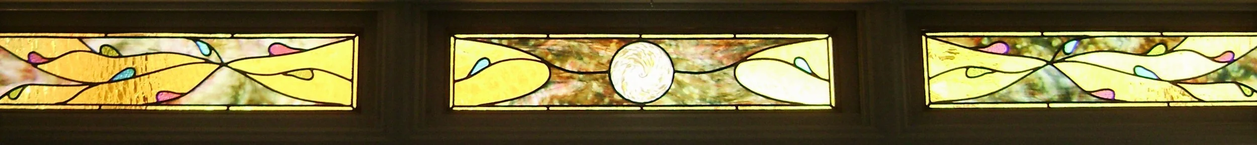 The colors I used to create a three window transom were inspired by the sweet disposition, golden coat, and pink collar of Lucy, my client’s Labrador Retriever.